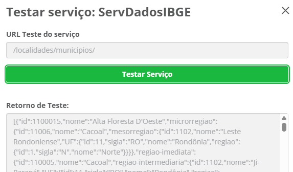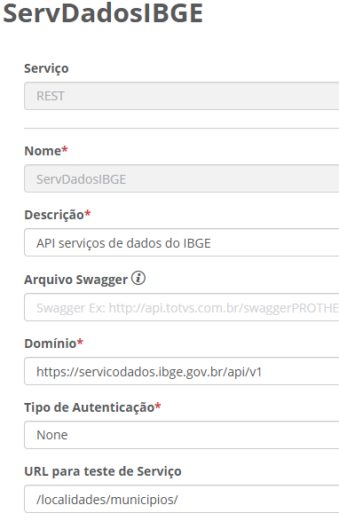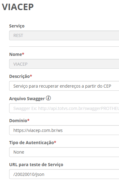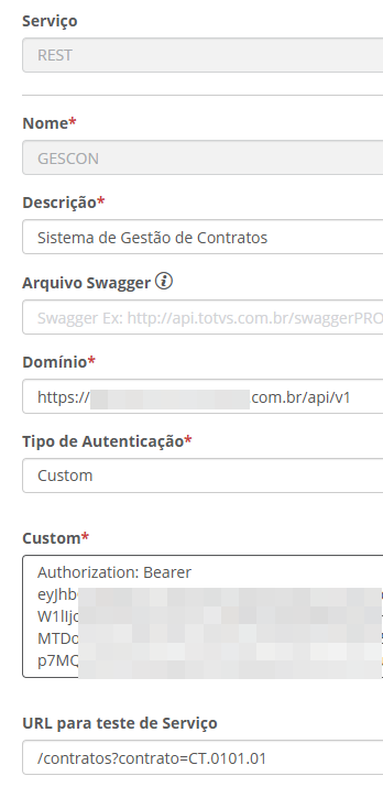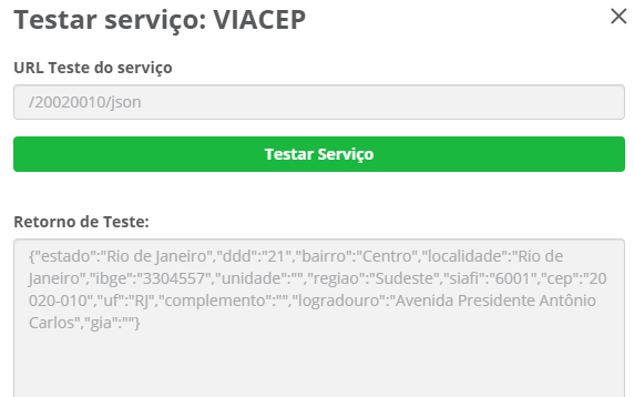 Após isso, o ultimo campo de preenchimento é o “URL para teste de Serviço”, nele você pode inserir uma URL teste pra validar que a consulta está de fato funcionando, lembrando que não é necessário inserir a base url novamente nessa url de teste, já que já foi informada no campo “Domínio”.